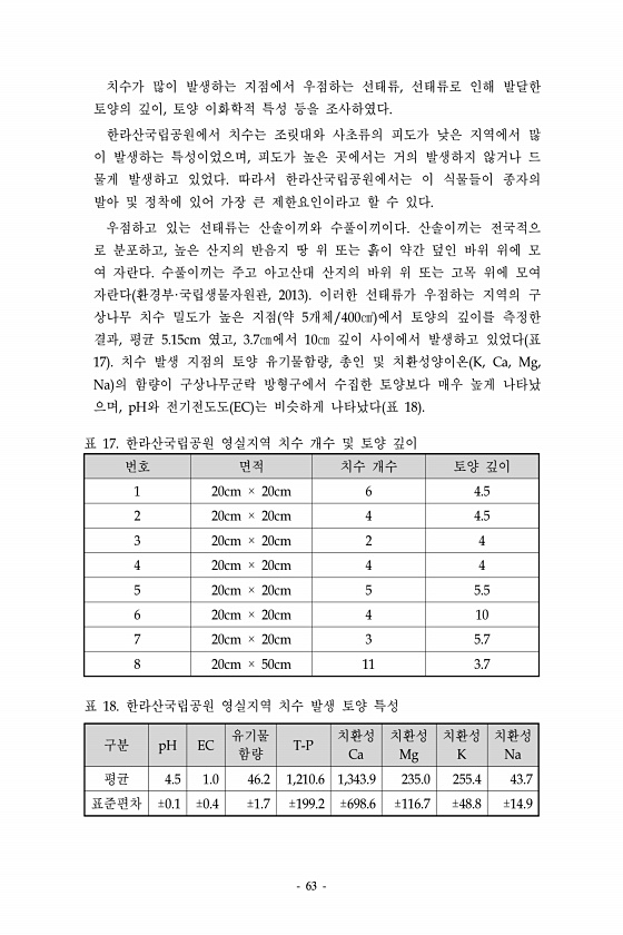 63 치수가 많이 발생하는 지점에서 우점하는 선태류, 선태류로 인해 발달한 토양의 깊이, 토양 이화학적 특성 등을 조사하였다. 한라산국립공원에서 치수는 조릿대와 사초류의 피도가 낮은 지역에서 많 이 발생하는 특성이었으며, 피도가 높은 곳에서는 거의 발생하지 않거나 드 물게 발생하고 있었다. 따라서 한라산국립공원에서는 이 식물들이 종자의 발아 및 정착에 있어 가장 큰 제한요인이라고 할 수 있다. 우점하고 있는 선태류는 산솔이끼와 수풀이끼이다. 산솔이끼는 전국적으 로 분포하고, 높은 산지의 반음지 땅 위 또는 흙이 약간 덮인 바위 위에 모 여 자란다. 수풀이끼는 주고 아고산대 산지의 바위 위 또는 고목 위에 모여 자란다 환경부·국립생물자원관, 2013 이러한 선태류가 우점하는 지역의 구 상나무 치수 밀도가 높은...