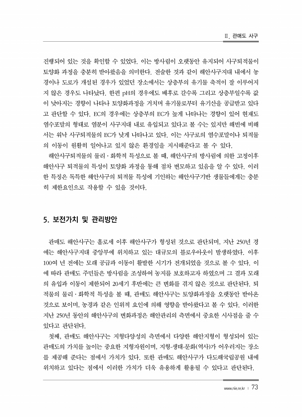 Ⅱ. 관매도 사구 www.nie.re.kr ? 73 진행되어 있는 것을 확인할 수 있었다. 이는 방사림이 오랫동안 유지되어 사구퇴적물이 토양화 과정을 충분히 받아왔음을 의미한다. 전술한 것과 같이 해안사구지대 내에서 농 경이나 도로가 개설된 경우가 있었던 장소에서는 상층부의 유기물 축적이 잘 이루어지 지 않은 경우도 나타났다. 한편 pH의 경우에도 배후로 갈수록 그리고 상층부일수록 값 이 낮아지는 경향이 나타나 토양화과정을 거치며 유기물로부터 유기산을 공급받고 있다 고 판단할 수 있다. EC의 경우에는 상층부의 EC가 높게 나타나는 경향이 있어 현재도 염수포말의 형태로 염분이 사구지대 내로 유입되고 있다고 볼 수는 있지만 해빈에 비해 서는 워낙 사구퇴적물의 EC가 낮게 나타나고 있다. 이는 사구로의 염수포말...