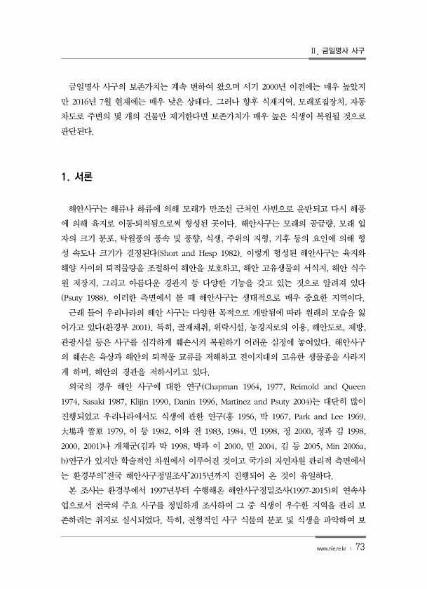 Ⅱ. 금일명사 사구 www.nie.re.kr ? 73 금일명사 사구의 보존가치는 계속 변하여 왔으며 서기 2000년 이전에는 매우 높았지 만 2016년 7월 현재에는 매우 낮은 상태다. 그러나 향후 식재지역, 모래포집장치, 자동 차도로 주변의 몇 개의 건물만 제거한다면 보존가치가 매우 높은 식생이 복원될 것으로 판단된다. 1. 서론 해안사구는 해류나 하류에 의해 모래가 만조선 근처인 사빈으로 운반되고 다시 해풍 에 의해 육지로 이동?퇴적됨으로써 형성된 곳이다. 해안사구는 모래의 공급량, 모래 입 자의 크기 분포, 탁월풍의 풍속 및 풍향, 식생, 주위의 지형, 기후 등의 요인에 의해 형 성 속도나 크기가 결정된다 Short and Hesp 1982 이렇게 형성된 해안사구는 육지와 해양 사이의 퇴적물량을 조절하...