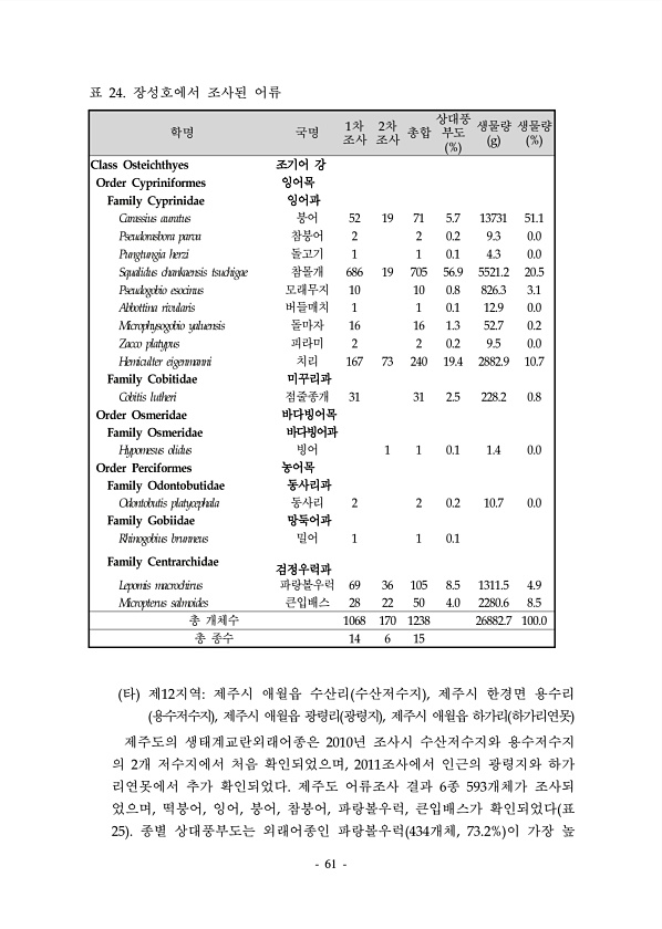 61 학명 국명 1차 조사 2차 조사 총합 상대풍 부도 % 생물량 g 생물량 % Class Osteichthyes 조기어 강 Order Cypriniformes 잉어목 Family Cyprinidae 잉어과 Carassius auratus 붕어 52 19 71 5.7 13731 51.1 Pseudorasbora parva 참붕어 2 2 0.2 9.3 0.0 Pungtungia herzi 돌고기 1 1 0.1 4.3 0.0 Squalidus chankaensis tsuchigae 참몰개 686 19 705 56.9 5521.2 20.5 Pseudogobio esocinus 모래무지 10 10 0.8 826.3 3.1 Abbottina rivularis 버들매치 1 1 0.1 12.9 0.0 Microphyso...