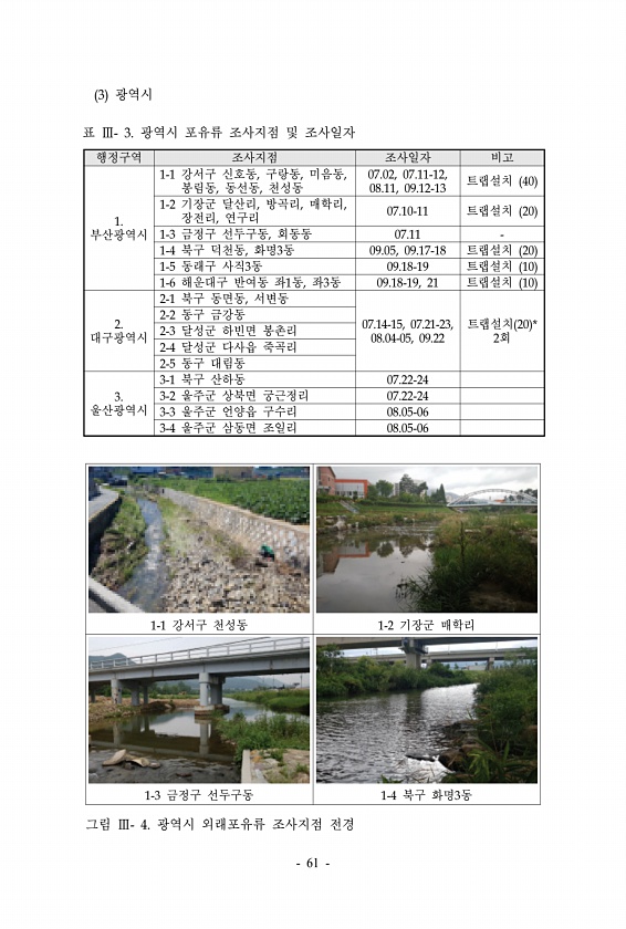 3 광역시 표 Ⅲ- 3. 광역시 포유류 조사지점 및 조사일자 행정구역 조사지점 조사일자 비고 1. 부산광역시 1-1 강서구 신호동, 구랑동, 미음동, 봉림동, 동선동, 천성동 07.02, 07.11-12, 08.11, 09.12-13 트랩설치 40 1-2 기장군 달산리, 방곡리, 매학리, 장전리, 연구리 07.10-11 트랩설치 20 1-3 금정구 선두구동, 회동동 07.11 1-4 북구 덕천동, 화명3동 09.05, 09.17-18 트랩설치 20 1-5 동래구 사직3동 09.18-19 트랩설치 10 1-6 해운대구 반여동 좌1동, 좌3동 09.18-19, 21 트랩설치 10 2. 대구광역시 2-1 북구 동면동, 서변동 07.14-15, 07.21-23, 08.04-05, 09.22 트랩설치 20 * 2회 ...