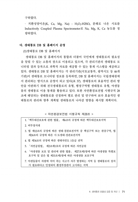 71 구하였다 치환성양이온 분해로 나온 시료를 로 농도를 정 량하였다 다 생태통로 및 홈페이지 운영 생태통로 및 홈페이지 생태통로 및 홈페이지의 통합과 더불어 국민에게 생태통로의 필요성 을 알릴 수 있는 소통의 장으로 이용되고 있으며 각 관리기관의 생태통로 모 니터링 결과 등록으로 과학적 자료를 제공할 수 있는 통계 시스템을 제공하고 있다 생태통로 및 홈페이지는 각 관리기관 국토교통부 광역시도 등 개 기관 이 생태통로 모니터링 정보를 등록하면 및 홈페이지는 국립생태원에 서 관리하는 방식으로 운영이 되고 있다 표 생태통로의 효율적인 관리 방 안을 마련하기 위해 전국생태통로의 유형 행정구역별 생태통로 유형 야생동 물의 생태통로 이용 통계를 활용하고 있다 또한 자연환경보전법 시행규칙 조에 해당되는 생태통로를 선정...
