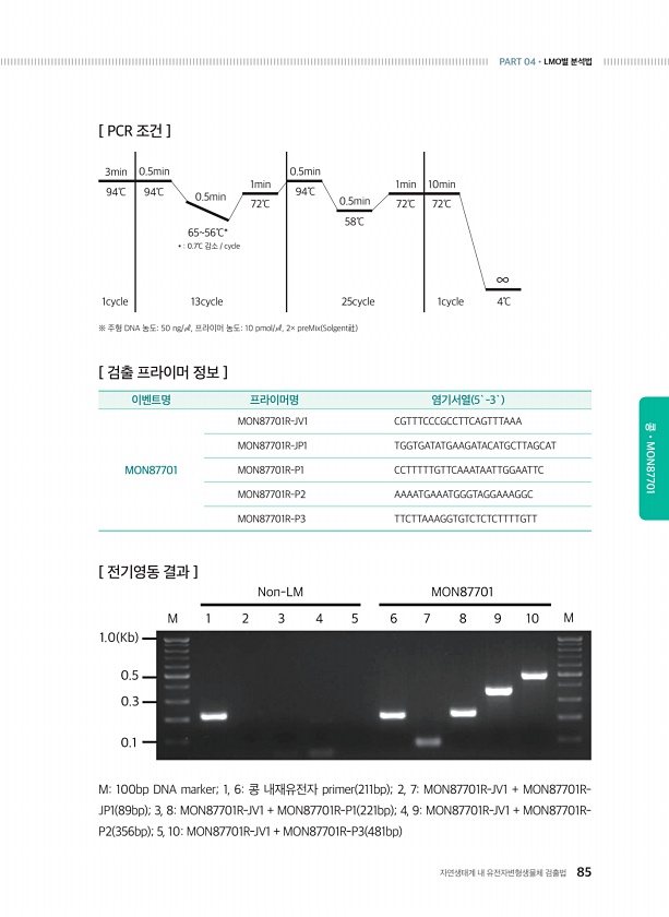 자연생태계 내 유전자변형생물체 검출법 85 PART 04?LMO별 분석법 콩?MON87701 [ 검출 프라이머 정보 ] 이벤트명 프라이머명 염기서열 5`-3` MON87701 MON87701R-JV1 CGTTTCCCGCCTTCAGTTTAAA MON87701R-JP1 TGGTGATATGAAGATACATGCTTAGCAT MON87701R-P1 CCTTTTTGTTCAAATAATTGGAATTC MON87701R-P2 AAAATGAAATGGGTAGGAAAGGC MON87701R-P3 TTCTTAAAGGTGTCTCTCTTTTGTT M100bp DNA marker; 1, 6콩 내재유전자 primer 211bp ; 2, 7MON87701R-JV1 + MON87701RJP1 89bp ; 3, 8MON87701R-JV1 + ...