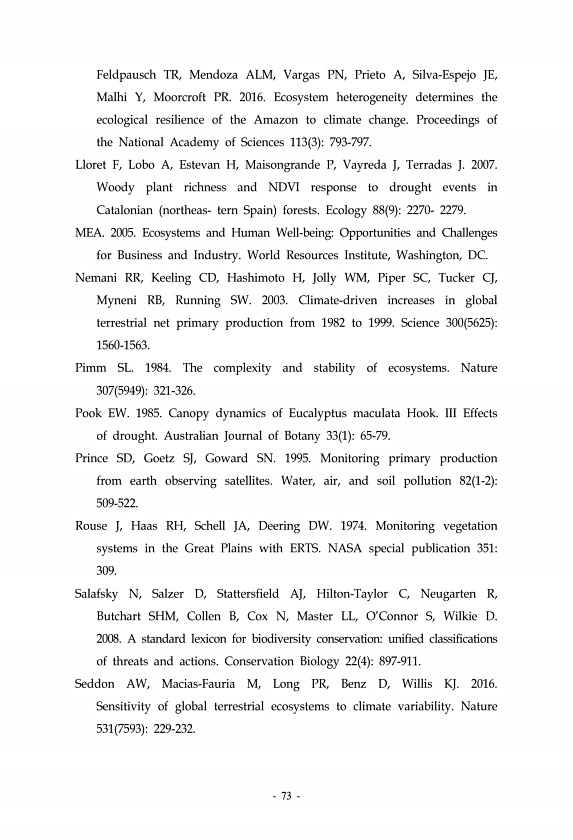 73 Feldpausch TR, Mendoza ALM, Vargas PN, Prieto A, Silva-Espejo JE, Malhi Y, Moorcroft PR. 2016. Ecosystem heterogeneity determines the ecological resilience of the Amazon to climate change. Proceedings of the National Academy of Sciences 113 3 793-797. Lloret F, Lobo A, Estevan H, Maisongrande P, Vayreda J, Terradas J. 2007. Woody plant richness and NDVI response to drought events in Catalonian ...