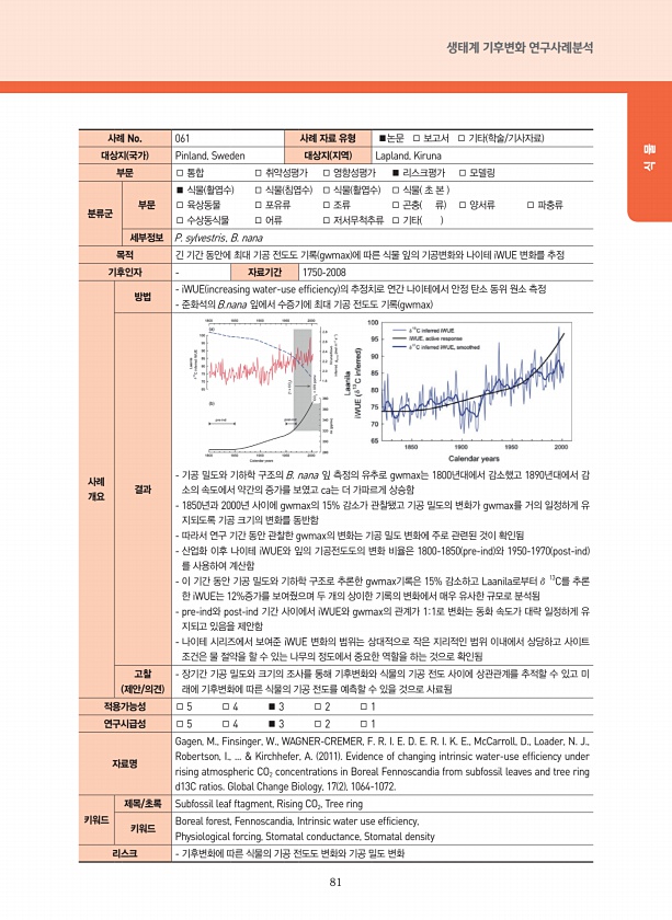 81 생태계 기후변화 연구사례분석 식 물 사례 No. 061 사례 자료 유형 ■논문 □ 보고서 □ 기타 학술/기사자료 대상지 국가 Pinland, Sweden 대상지 지역 Lapland, Kiruna 부문 □ 통합 □ 취약성평가 □ 영향성평가 ■ 리스크평가 □ 모델링 분류군 부문 ■ 식물 활엽수 □ 식물 침엽수 □ 식물 활엽수 □ 식물 초 본 □ 육상동물 □ 포유류 □ 조류 □ 곤충 류 □ 양서류 □ 파충류 □ 수상동식물 □ 어류 □ 저서무척추류 □ 기타 세부정보 P. sylvestris, B. nana 목적 긴 기간 동안에 최대 기공 전도도 기록 gwmax 에 따른 식물 잎의 기공변화와 나이테 iWUE 변화를 추정 기후인자 자료기간 1750-2008 사례 개요 방법 iWUE increasing water-...
