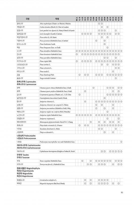 81 분비나무 Abies nephrolepis Trautv. ex Maxim. Maxim. ○ ○ 개잎갈나무 Cedrus deodara Roxb. G. Don in Loudon ○ ○ 잎갈나무 Larix gmelinii var. olgensis A. Henry Ostenf. & Syrach ○ ○ ○ ○ 일본잎갈나무 Larix kaempferi Lamb. Carriere ○ ○ ○ ○ ○ ○ ○ ○ ○ ○ ○ 독일가문비나무 Picea abies L. H. Karst. ○ ○ 가문비나무 Picea jezoensis Siebold & Zucc. Carriere ○ ○ 방크스소나무 Pinus banksiana Lamb. ○ 백송 Pinus bungeana Zucc. ex Endl. ○ 소나무 Pinus densi...