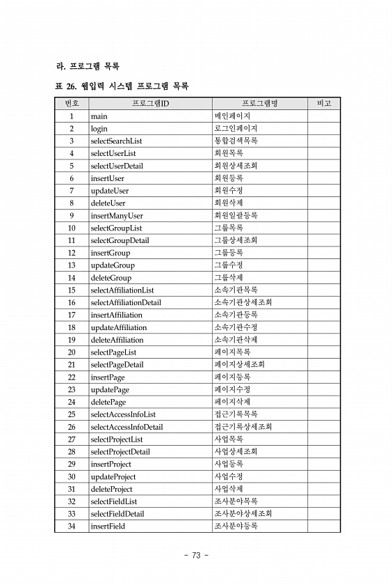 73 번호 프로그램ID 프로그램명 비고 1 main 메인페이지 2 login 로그인페이지 3 selectSearchList 통합검색목록 4 selectUserList 회원목록 5 selectUserDetail 회원상세조회 6 insertUser 회원등록 7 updateUser 회원수정 8 deleteUser 회원삭제 9 insertManyUser 회원일괄등록 10 selectGroupList 그룹목록 11 selectGroupDetail 그룹상세조회 12 insertGroup 그룹등록 13 updateGroup 그룹수정 14 deleteGroup 그룹삭제 15 selectAffiliationList 소속기관목록 16 selectAffiliationDetail 소속기관상세조회 17 insertAffiliati...