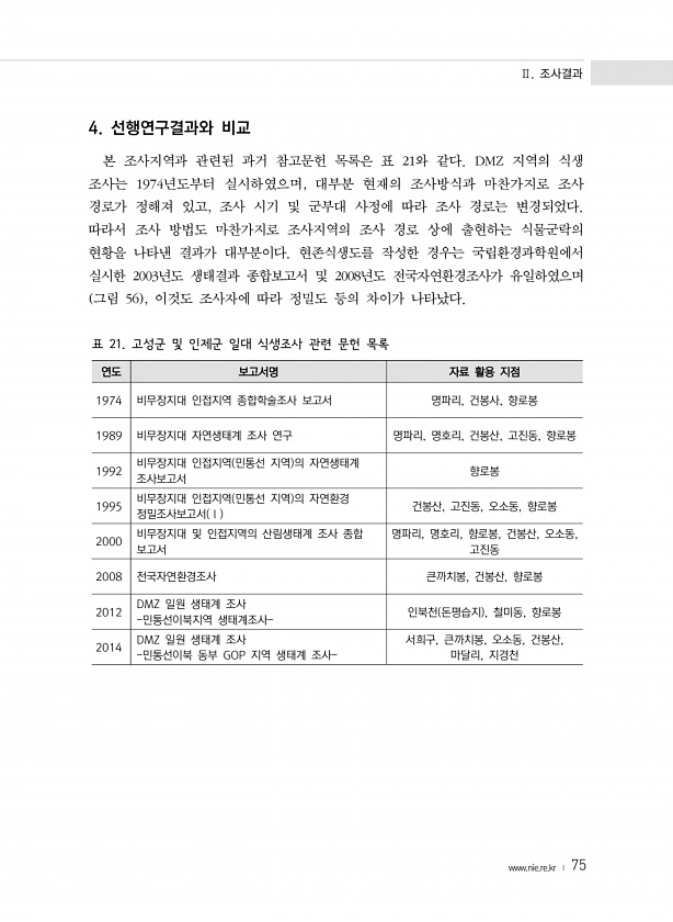 Ⅱ. 조사결과 www.nie.re.kr ? 75 4. 선행연구결과와 비교 본 조사지역과 관련된 과거 참고문헌 목록은 표 21와 같다. DMZ 지역의 식생 조사는 1974년도부터 실시하였으며, 대부분 현재의 조사방식과 마찬가지로 조사 경로가 정해져 있고, 조사 시기 및 군부대 사정에 따라 조사 경로는 변경되었다. 따라서 조사 방법도 마찬가지로 조사지역의 조사 경로 상에 출현하는 식물군락의 현황을 나타낸 결과가 대부분이다. 현존식생도를 작성한 경우는 국립환경과학원에서 실시한 2003년도 생태결과 종합보고서 및 2008년도 전국자연환경조사가 유일하였으며 그림 56 , 이것도 조사자에 따라 정밀도 등의 차이가 나타났다. 연도 보고서명 자료 활용 지점 1974 비무장지대 인접지역 종합학술조사 보고서 명파리, 건봉사,...