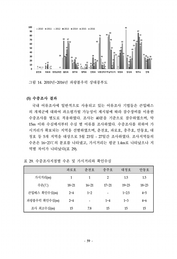 59 그림 14. 2010년2016년 파랑볼우럭 상대풍부도 5 수중조사 결과 국내 어류조사에 일반적으로 사용되고 있는 어류조사 기법들은 큰입배스 의 개체군에 대하여 과소평가될 가능성이 제시됨에 따라 잠수장비를 이용한 수중조사를 별도로 적용하였다. 조사는 40분을 기준으로 잠수하였으며, 약 15m 이하 수심에서부터 수심 별 어류를 조사하였다. 수중조사를 위하여 가 시거리가 확보되는 지역을 선별하였으며, 춘천호, 파로호, 충주호, 안동호, 대 청호 등 5개 지역을 대상으로 5월 23일 27일간 조사하였다. 조사지역들의 수온은 1623℃의 분포를 나타냈고, 가시거리는 평균 1.4m로 나타났으나 지 역별 차이가 나타났다 표 29 파로호 춘천호 충주호 대청호 안동호 가시거리 m 1 1 2 1.5 1.5 수온 ℃ 18...