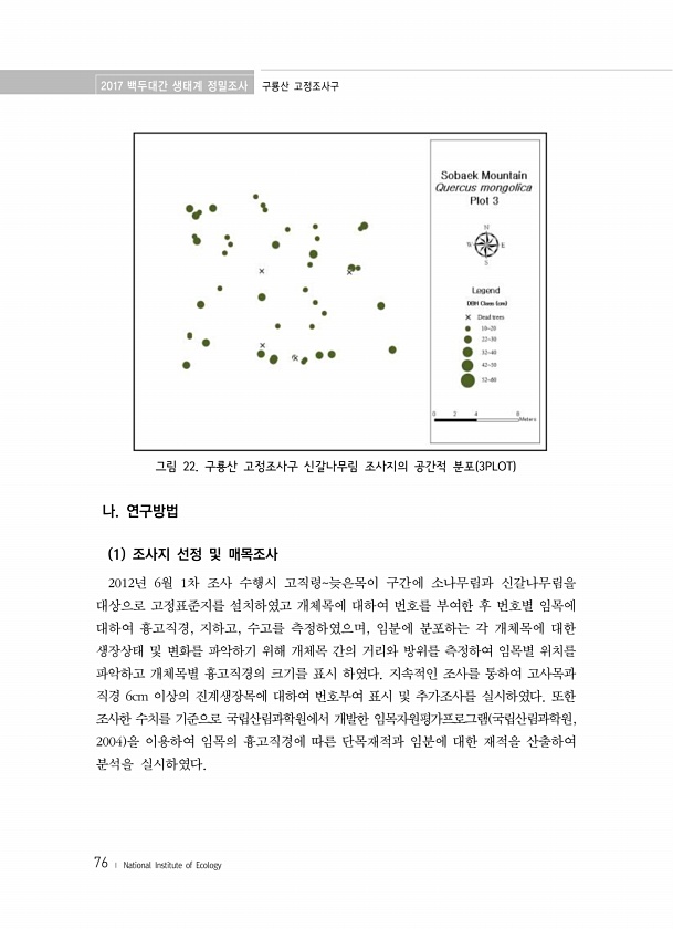 2017 백두대간 생태계 정밀조사 구룡산 고정조사구 76 ? National Institute of Ecology 그림 22. 구룡산 고정조사구 신갈나무림 조사지의 공간적 분포 3PLOT 나. 연구방법 1 조사지 선정 및 매목조사 2012년 6월 1차 조사 수행시 고직령늦은목이 구간에 소나무림과 신갈나무림을 대상으로 고정표준지를 설치하였고 개체목에 대하여 번호를 부여한 후 번호별 임목에 대하여 흉고직경, 지하고, 수고를 측정하였으며, 임분에 분포하는 각 개체목에 대한 생장상태 및 변화를 파악하기 위해 개체목 간의 거리와 방위를 측정하여 임목별 위치를 파악하고 개체목별 흉고직경의 크기를 표시 하였다. 지속적인 조사를 통하여 고사목과 직경 6cm 이상의 진계생장목에 대하여 번호부여 표시 및 추가조사를 실시하였다...