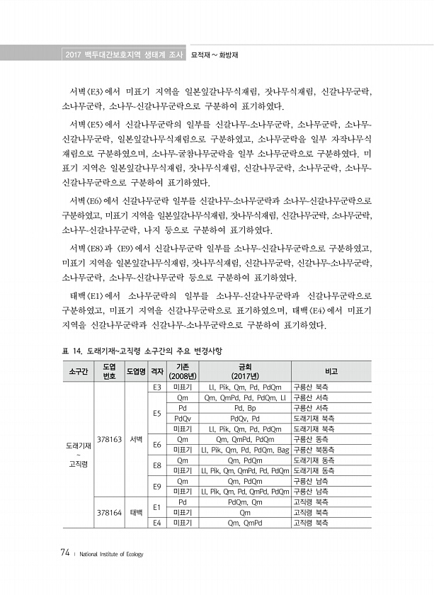2017 백두대간보호지역 생태계 조사 묘적재 화방재 74 ? National Institute of Ecology 서벽 E3 에서 미표기 지역을 일본잎갈나무식재림, 잣나무식재림, 신갈나무군락, 소나무군락, 소나무-신갈나무군락으로 구분하여 표기하였다. 서벽 E5 에서 신갈나무군락의 일부를 신갈나무-소나무군락, 소나무군락, 소나무- 신갈나무군락, 일본잎갈나무식재림으로 구분하였고, 소나무군락을 일부 자작나무식 재림으로 구분하였으며, 소나무-굴참나무군락을 일부 소나무군락으로 구분하였다. 미 표기 지역은 일본잎갈나무식재림, 잣나무식재림, 신갈나무군락, 소나무군락, 소나무- 신갈나무군락으로 구분하여 표기하였다. 서벽 E6 에서 신갈나무군락 일부를 신갈나무-소나무군락과 소나무-신갈나무군락으로 구분하였고, 미표기 지역을 ...