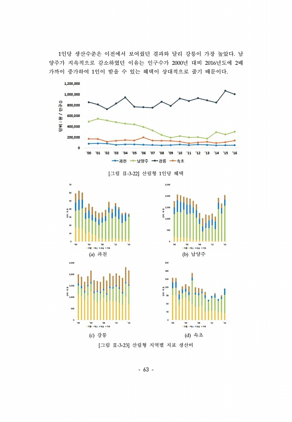63 1인당 생산수준은 이전에서 보여줬던 결과와 달리 강릉이 가장 높았다. 남 양주가 지속적으로 감소하였던 이유는 인구수가 2000년 대비 2016년도에 2배 가까이 증가하여 1인이 받을 수 있는 혜택이 상대적으로 줄기 때문이다. [그림 Ⅱ-3-22] 산림형 1인당 혜택 a 과천 b 남양주 c 강릉 d 속초 [그림 Ⅱ-3-23] 산림형 지역별 지표생산비