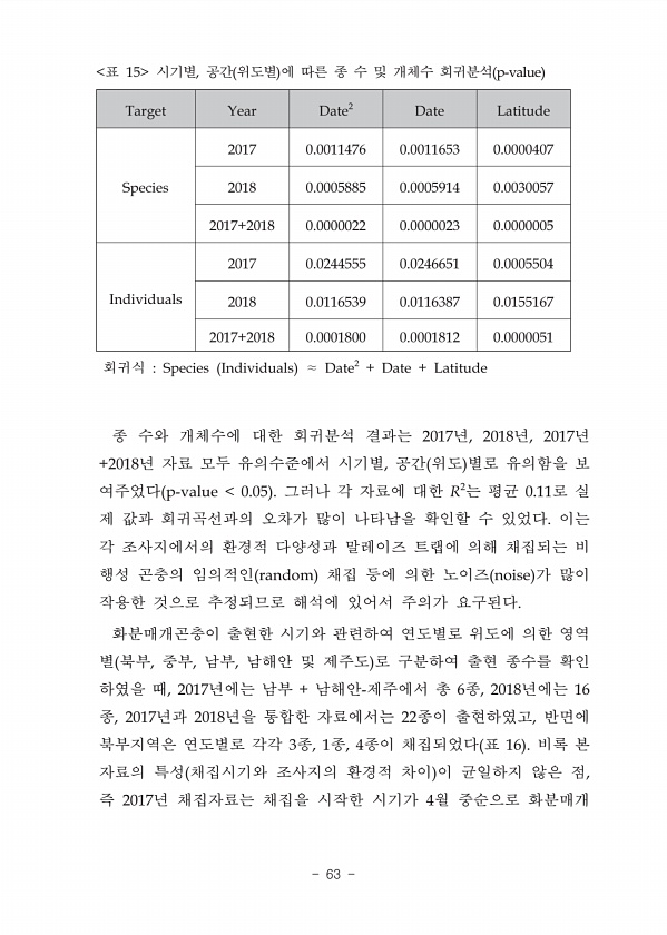 Target Year Date2 Date Latitude Species 2017 0.0011476 0.0011653 0.0000407 2018 0.0005885 0.0005914 0.0030057 2017+2018 0.0000022 0.0000023 0.0000005 Individuals 2017 0.0244555 0.0246651 0.0005504 2018 0.0116539 0.0116387 0.0155167 2017+2018 0.0001800 0.0001812 0.0000051 Species Individuals Date2 + Date + Latitude 15 ? , p-value 2017 , 2018 , 2017 +2018 ? , p-value 0.05 ? ? R2 ?0.11 ? ? random noi...