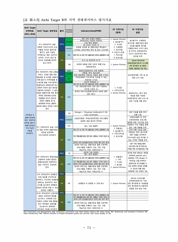 73 Aichi Target 전략목표 2011-2020 Aichi Target 세부목표 출처 Conceptual Framework Indicator/index DPSIR ES 지역지표 항목 ES 지역지표 설명 전략목표 B생물다양성에 대한 직접적인 압박을 줄이고 생물다양성의 지속가능한 이용을 장려한다. B-52020년까지 숲을 포함한 자연서식지의 손실 비율을 최소한 절반으로 줄이고, 실현 가능한 지역에서는 제로 수준까지 낮추며, 서식지 붕괴 및 토지의 파편화를 현격히 감소시킨다. IPBES DD/BEF 국토 대비 산림의 비율 S 1. Species Richness 2. 임산물가치 3. 수산업 4. 수원함양 5. 침식조절 6. 온실가스조절 7. 대기조절 8. 침식조절 임산물가치, 수원함양, 침식조절, 생물다양성...