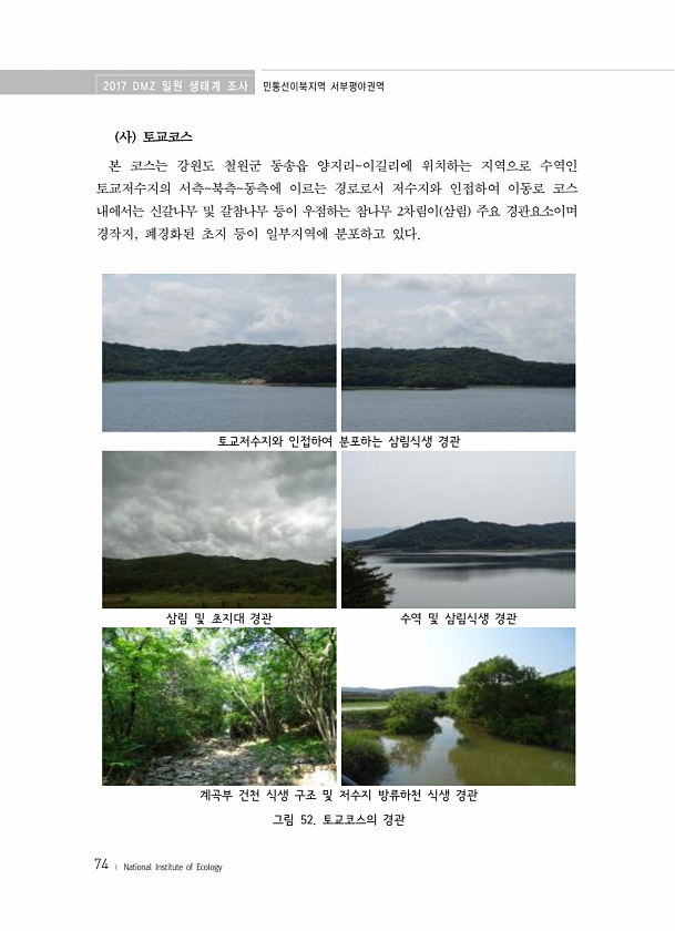 2017 DMZ 일원 생태계 조사 민통선이북지역 서부평야권역 74 ? National Institute of Ecology 사 토교코스 본 코스는 강원도 철원군 동송읍 양지리이길리에 위치하는 지역으로 수역인 토교저수지의 서측북측동측에 이르는 경로로서 저수지와 인접하여 이동로 코스 내에서는 신갈나무 및 갈참나무 등이 우점하는 참나무 2차림이 삼림 주요 경관요소이며 경작지, 폐경화된 초지 등이 일부지역에 분포하고 있다. 토교저수지와 인접하여 분포하는 삼림식생 경관 삼림 및 초지대 경관 수역 및 삼림식생 경관 계곡부 건천 식생 구조 및 저수지 방류하천 식생 경관 그림 52. 토교코스의경관