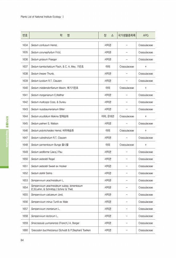 84 번호 학 명 장 소 국가생물종목록 APG 피자식물문 Magnoliophyta Plants List of National Institute Ecology Ⅰ 1634 Sedum confusum Hemsl. 사막관 Crassulaceae 1635 Sedum corynephyllum Fr?d. 사막관 Crassulaceae 1636 Sedum griseum Praeger 사막관 Crassulaceae 1637 Sedum kamtschaticum Fisch. & C. A. Mey. 기린초 야외 Crassulaceae + 1638 Sedum lineare Thunb. 사막관 Crassulaceae 1639 Sedum lucidum R.T. Clausen 사막관 Crassulaceae 1640 Sedum midd...