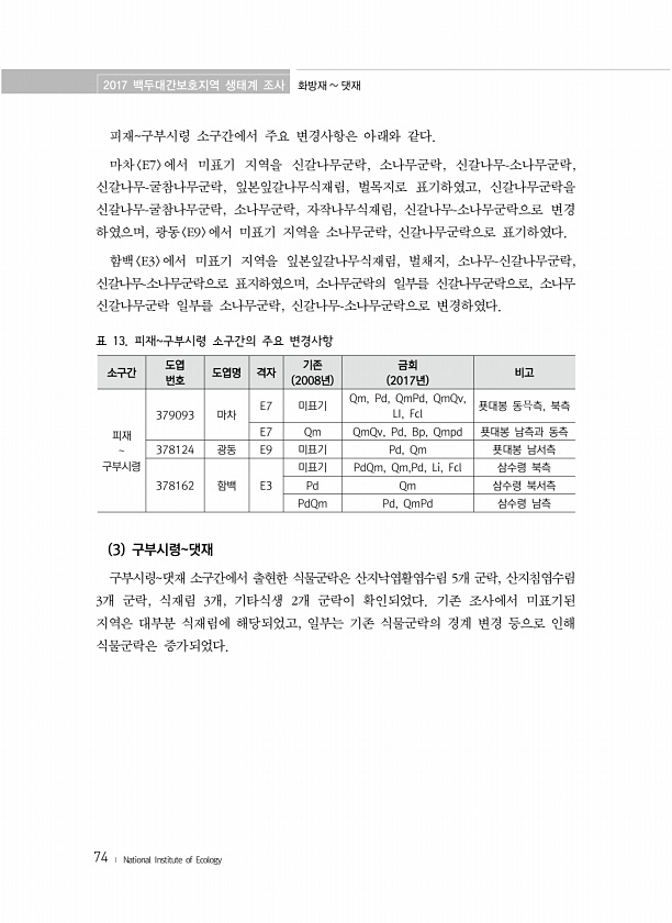 2017 백두대간보호지역 생태계 조사 화방재 댓재 74 ? National Institute of Ecology 피재구부시령 소구간에서 주요 변경사항은 아래와 같다. 마차 E7 에서 미표기 지역을 신갈나무군락, 소나무군락, 신갈나무-소나무군락, 신갈나무-굴참나무군락, 잎본잎갈나무식재림, 벌목지로 표기하였고, 신갈나무군락을 신갈나무-굴참나무군락, 소나무군락, 자작나무식재림, 신갈나무-소나무군락으로 변경 하였으며, 광동 E9 에서 미표기 지역을 소나무군락, 신갈나무군락으로 표기하였다. 함백 E3 에서 미표기 지역을 잎본잎갈나무식재림, 벌채지, 소나무-신갈나무군락, 신갈나무-소나무군락으로 표지하였으며, 소나무군락의 일부를 신갈나무군락으로, 소나무 신갈나무군락 일부를 소나무군락, 신갈나무-소나무군락으로 변경하였다....