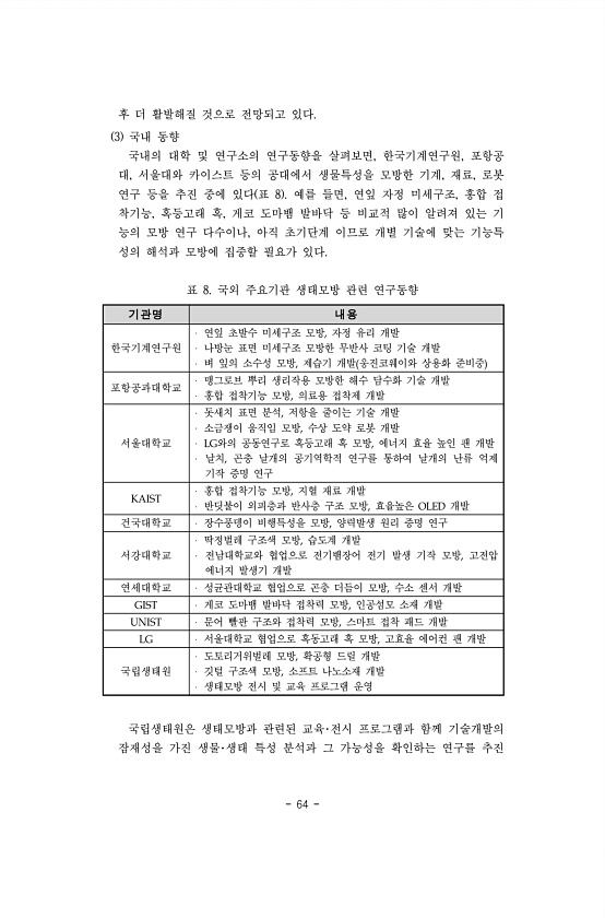 64 후 더 활발해질 것으로 전망되고 있다. 3 국내 동향 국내의 대학 및 연구소의 연구동향을 살펴보면, 한국기계연구원, 포항공 대, 서울대와 카이스트 등의 공대에서 생물특성을 모방한 기계, 재료, 로봇 연구 등을 추진 중에 있다 표 8 예를 들면, 연잎 자정 미세구조, 홍합 접 착기능, 혹등고래 혹, 게코 도마뱀 발바닥 등 비교적 많이 알려져 있는 기 능의 모방 연구 다수이나, 아직 초기단계 이므로 개별 기술에 맞는 기능특 성의 해석과 모방에 집중할 필요가 있다. 표 8. 국외 주요기관 생태모방 관련 연구동향 기관명 내용 한국기계연구원 연잎 초발수 미세구조 모방, 자정 유리 개발 나방눈 표면 미세구조 모방한 무반사 코팅 기술 개발 벼 잎의 소수성 모방, 제습기 개발 웅진코웨이와 상용화 준비중 포항공과대학교...