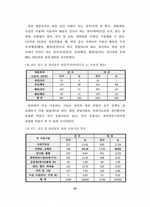 66 하천 방문목적은 하천 공간 자체가 되는 경우 산책 및 휴식, 생태체험, 수공간 이용 와 이용자의 활동이 중심이 되는 경우 체력/건강 유지, 통근 및 통학, 문화행사 참여, 여가 및 교류, 애완동물 산책 로 구분해볼 수 있다. 1순위와 2순위로 설문하였을 때, 하천 공간 자체보다 이용자 활동을 우선 목적 활동/활동, 활동/공간 으로 하고 있었다 표 46 하나라도 하천 공간 자체가 목적이 되는 경우 공간/공간, 공간/활동, 활동/공간 는 전국표본 중에 88%, 대전표본 중에 82%를 차지하였다. 표 46 전국 및 대전표본 방문목적 하천공간 vs 이용자 활동 방문목적 1순위, 2순위 전 국 대 전 건수 % 건수 % 공간/공간 25 3 26 1 공간/활동 274 32 614 33 활동/공간 449 53 905...
