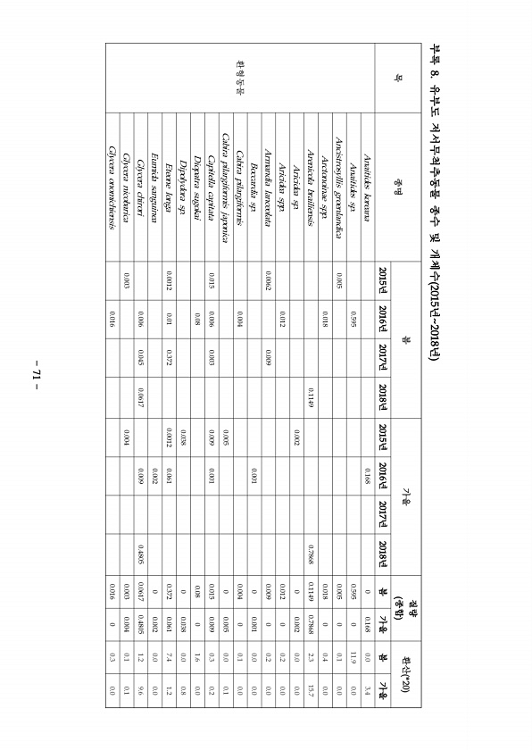 목 종명 봄 가을 질량 종합 환산 *20 2015년 2016년 2017년 2018년 2015년 2016년 2017년 2018년 봄 가을 봄 가을 환형동물 Anaitides koreana 0.168 0 0.168 0.0 3.4 Anaitides sp. 0.595 0.595 0 11.9 0.0 Ancistrosyllis groenlandica 0.005 0.005 0 0.1 0.0 Arctonoinae spp. 0.018 0.018 0 0.4 0.0 Arenicola brailiensis 0.1149 0.7868 0.1149 0.7868 2.3 15.7 Aricidea sp. 0.002 0 0.002 0.0 0.0 Aricidea spp. 0.012 0.012 0 0.2 0.0 Armandia lanceolat...