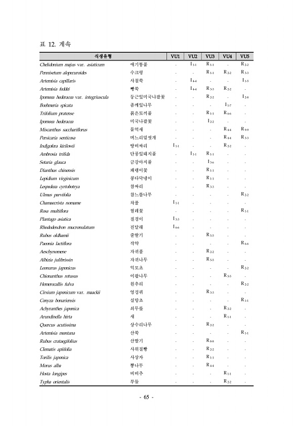 65 식생유형 VU1 VU2 VU3 VU4 VU5 Chelidonium majus var. asiaticum 애기똥풀 I 1-1 R 1-1 R 2-2 Pennisetum alopecuroides 수크령 R 1-1 R 2-2 R 3-3 Artemisia capillaris 사철쑥 I 4-4 I 1-5 Artemisia feddei 뺑쑥 I 4-4 R 3-3 R 2-2 Ipomoea hederacea var. integriuscula 둥근잎미국나팔꽃 R 2-2 I 2-8 Boehmeria spicata 좀깨잎나무 I 1-7 Trifolium pratense 붉은토끼풀 R 1-1 R 6-6 Ipomoea hederacea 미국나팔꽃 I 2-2 Miscanthus sacchariflorus 물억새 R 4-4 R 9...