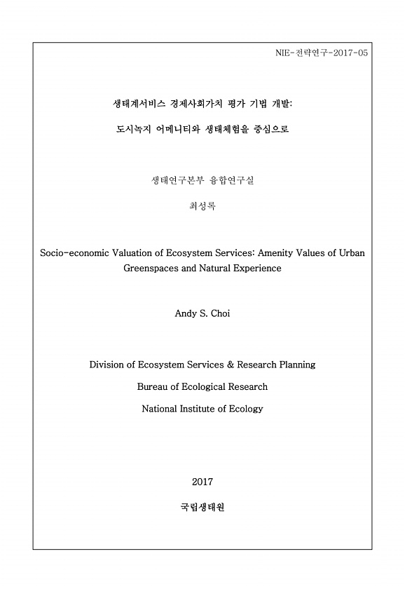 NIE-전략연구-2017-05 생태계서비스 경제사회가치 평가 기법 개발도시녹지 어메니티와 생태체험을 중심으로 생태연구본부 융합연구실 최성록 Socio-economic Valuation of Ecosystem ServicesAmenity Values of Urban Greenspaces and Natural Experience Andy S. Choi Division of Ecosystem Services & Research Planning Bureau of Ecological Research National Institute of Ecology 2017국립생태원