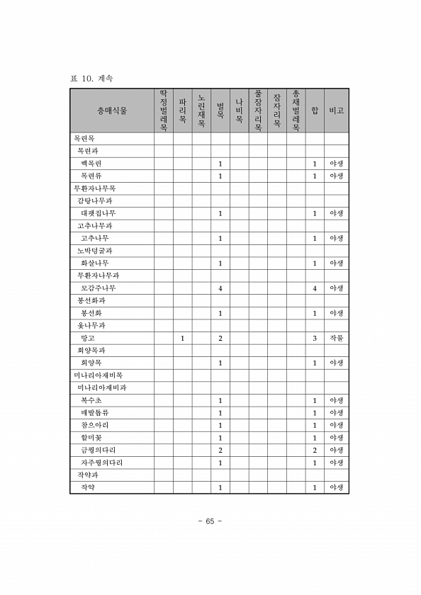 65 충매식물 딱정벌레목 파리목 노린재목 벌목 나비목 풀잠자리목 잠자리목 총채벌레목 합 비고 목련목 목련과 백목련 1 1 야생 목련류 1 1 야생 무환자나무목 감탕나무과 대팻집나무 1 1 야생 고추나무과 고추나무 1 1 야생 노박덩굴과 화살나무 1 1 야생 무환자나무과 모감주나무 4 4 야생 봉선화과 봉선화 1 1 야생 옻나무과 망고 1 2 3 작물 회양목과 회양목 1 1 야생 미나리아재비목 미나리아재비과 복수초 1 1 야생 매발톱류 1 1 야생 참으아리 1 1 야생 할미꽃 1 1 야생 금꿩의다리 2 2 야생 자주꿩의다리 1 1 야생 작약과 작약 1 1 야생 표 10.계속