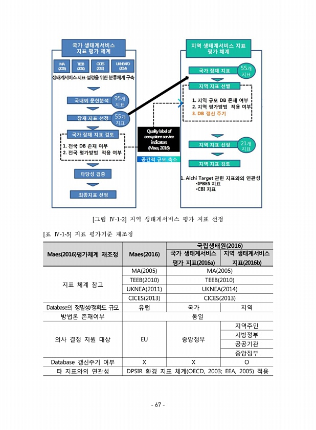 [그림 Ⅳ-1-2] 지역 생태계서비스 평가 지표 선정 Maes 2016 평가체계 재조정 Maes 2016 국립생태원 2016 국가 생태계서비스 평가 지표 2016a 지역 생태계서비스 지표 2016b 지표 체계 참고 MA 2005 MA 2005 TEEB 2010 TEEB 2010 UKNEA 2011 UKNEA 2014 CICES 2013 CICES 2013 Database의 정밀성/정확도 규모 유럽 국가 지역 방법론 존재여부 동일 의사 결정 지원 대상 EU 중앙정부 지역주민 지방정부 공공기관 중앙정부 Database 갱신주기 여부 X X O 타 지표와의 연관성 DPSIR 환경 지표 체계 OECD, 2003; EEA, 2005 적용 [표 Ⅳ-1-5] 지표 평가기준 재조정 67