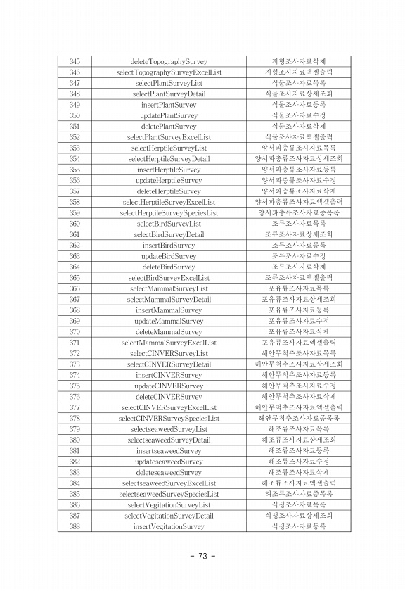73 345 deleteTopographySurvey 지형조사자료삭제 347 selectTopographySurveyExcelList 지형조사자료abcd 349 selectPlantSurveyList 식물조사자료목록 34? selectPlantSurvey3etail 식물조사자료45조0 34B insertPlantSurvey 식물조사자료8록 35G updatePlantSurvey 식물조사자료? deletePlantSurvey 식물조사자료삭제? selectPlantSurveyExcelList 식물조사자료abcd 353 select갻rptileSurveyList 양서파충류조사자료목록 354 select갻rptileSurvey3etail 양서파충류조사자료45조0 355 insert갻rptileSurvey 양서파충류...