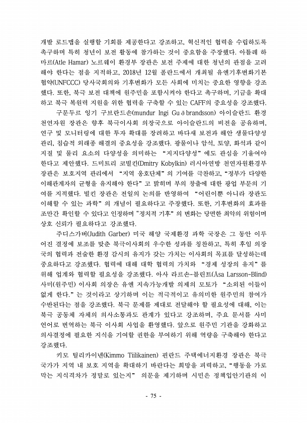 75 개발 로드맵을 실행할 기회를 제공한다고 강조하고, 혁신적인 협력을 수립하도록 촉구하며 특히 청년이 보전 활동에 참가하는 것이 중요함을 주장했다. 아틀레 하 마르 Atle Hamar 노르웨이 환경부 장관은 보전 주제에 대한 청년의 관점을 고려 해야 한다는 점을 지적하고, 2018년 12월 폴란드에서 개최될 유엔기후변화기본 협약 UNFCCC 당사국회의와 기후변화가 모든 사회에 미치는 중요한 영향을 강조 했다. 또한, 북극 보전 대책에 원주민을 포함시켜야 한다고 촉구하며, 기금을 확대 하고 북극 복원력 지원을 위한 협력을 구축할 수 있는 CAFF의 중요성을 강조했다. 구문두르 잉기 구브란드손 mundur Ingi Guðbrandsson 아이슬란드 환경 천연자원 장관은 향후 북극이사회 의장국으로 아이슬란드의 ...