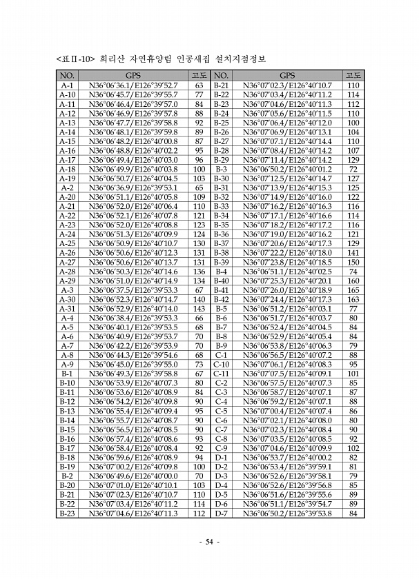54 NO. GPS 고도 NO. GPS 고도 A-1 N36°0636.1/E126°3952.7 63 B-21 N36°0702.3/E126°4010.7 110 A-10 N36°0645.7/E126°3955.7 77 B-22 N36°0703.4/E126°4011.2 114 A-11 N36°0646.4/E126°3957.0 84 B-23 N36°0704.6/E126°4011.3 112 A-12 N36°0646.9/E126°3957.8 88 B-24 N36°0705.6/E126°4011.5 110 A-13 N36°0647.7/E126°3958.8 92 B-25 N36°0706.4/E126°4012.0 100 A-14 N36°0648.1/E126°3959.8 89 B-26 N36°0706.9/E126°4013.1 10...