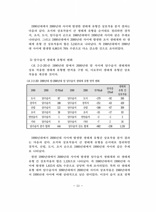 53 1990년대에서 2000년대 사이에 발생한 생태계 유형간 상호작용 분석 결과는 다음과 같다. 초지와 상호작용이 큰 생태계 유형을 순서대로 정리하면 경작 지, 초지, 도시, 담수습지 순으로 1980년대에서 1990년대 사이와 같은 추세로 나타났다. 그리고 1990년대에서 2000년대 사이에 발생한 초지 생태계와 타 생 태계 유형 간 상호작용의 합은 5,243으로 나타났다. 즉 1980년대에서 1990년 대 사이에 발생한 6,861의 76% 수준으로 다소 감소한 것으로 조사되었다. 5 담수습지 생태계 유형의 변화 표 2-2-20 은 1990년대 말에서 2000년대 말 사이에 담수습지 생태계와 상호 작용한 생태계 유형별 면적을 구한 뒤, 이로부터 생태계 유형간 상호 작용을 계산한 것이다. 1990 2000 ...