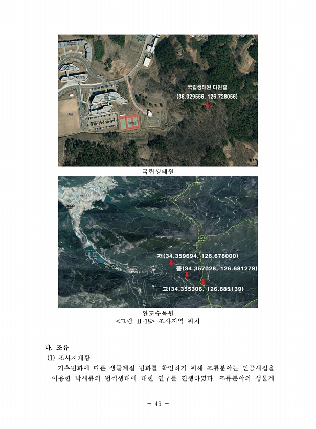 49 국립생태원 완도수목원 그림 Ⅱ-18 조사지역 위치 다. 조류 1 조사지개황 기후변화에 따른 생물계절 변화를 확인하기 위해 조류분야는 인공새집을 이용한 박새류의 번식생태에 대한 연구를 진행하였다. 조류분야의생물계