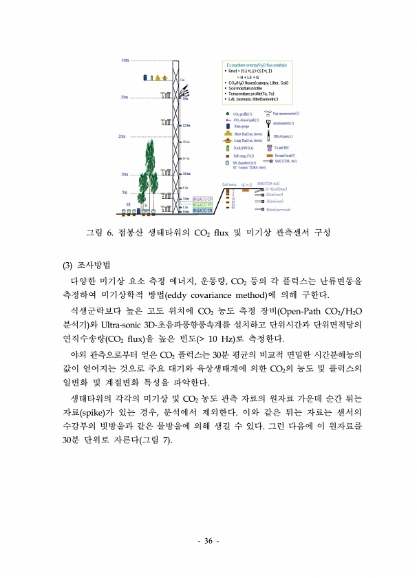 36 그림 6. 점봉산 생태타워의 CO2 flux 및 미기상 관측센서 구성 3 조사방법 다양한 미기상 요소 측정 에너지, 운동량, CO2 등의 각 플럭스는 난류변동을 측정하여 미기상학적 방법 eddy covariance method 에 의해 구한다. 식생군락보다 높은 고도 위치에 CO2 농도 측정 장비 Open-Path CO2/H2O 분석기 와 Ultra-sonic 3D-초음파풍향풍속계를 설치하고 단위시간과 단위면적당의 연직수송량 CO2 flux 을 높은 빈도 10 Hz 로 측정한다. 야외 관측으로부터 얻은 CO2 플럭스는 30분 평균의 비교적 면밀한 시간분해능의 값이 얻어지는 것으로 주요 대기와 육상생태계에 의한 CO2의 농도 및 플럭스의 일변화 및 계절변화 특성을 파악한다. 생태타워의 각각의 미기상 및 ...