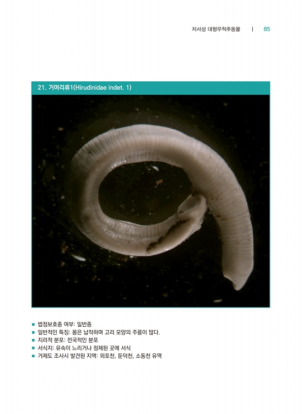 저서성 대형무척추동물 ┃ 85 21. 거머리류1 Hirudinidae indet. 1 ■ 법정보호종 여부일반종 ■ 일반적인 특징몸은 납작하며 고리 모양의 주름이 많다. ■ 지리적 분포전국적인 분포 ■ 서식지유속이 느리거나 정체된 곳에 서식 ■ 거제도 조사시 발견된 지역외포천, 둔덕천, 소동천유역