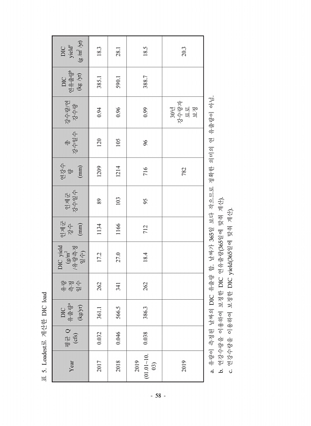 Year Q cfs DIC a kg/yr DIC yield g/m2 mm mm DIC b kg /yr DIC yieldc g /m2 /yr 2017 0.032 361.1 262 17.2 1134 89 1209 120 0.94 385.1 18.3 2018 0.046 566.5 341 27.0 1166 103 1214 105 0.96 590.1 28.1 2019 01.0110. 03 0.038 386.3 262 18.4 712 95 716 96 0.99 388.7 18.5 2019 782 30 20.3 a. DIC 365 b. DIC 365 c. DIC yield 365 5. Loadest DICload