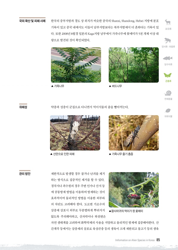 포유류 양서류 · 파충류 담수어류 곤충류 연체동물 외래식물 Imformation on Alien Species in Korea 85 국외 확산 및 피해 사례 한국의 중부지방과 경도 상 위치가 비슷한 중국의 Shanxi, Shandong, Hebei 지방에 분포 기록이 있고 중국 내에서도 이들이 남부지방보다는 북부지방에서 더 흔하다는 기록이 있 다. 또한 2008년 8월경 일본의 Kaga지방 남부에서 가죽나무에 꽃매미가 5천 개체 이상 대 량으로 발견된 것이 확인되었다. 위해성 약충과 성충이 군집으로 다니면서 먹이식물의 즙을 빨아먹는다. 관리 방안 제한적으로 발생할 경우 잡거나 난괴를 제거 하는 방식으로 집중적인 제거를 할 수 있다. 경작지나 과수원의 경우 주변 인가나 산지 등 에 공동방제 방법을 이용하여 방...