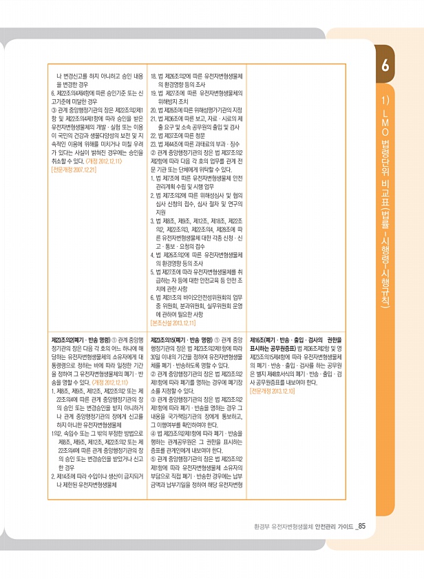 6 환경부 유전자변형생물체 안전관리 가이드 _85 1 L M O 법령단위 비교표 법률- 시행령- 시행규칙 나 변경신고를 하지 아니하고 승인 내용 을 변경한 경우 6. 제22조의4제4항에 따른 승인기준 또는 신 고기준에 미달한 경우 ③ 관계 중앙행정기관의 장은 제22조의2제1 항 및 제22조의4제1항에 따라 승인을 받은 유전자변형생물체의 개발ㆍ실험 또는 이용 이 국민의 건강과 생물다양성의 보전 및 지 속적인 이용에 위해를 미치거나 미칠 우려 가 있다는 사실이 밝혀진 경우에는 승인을 취소할 수 있다. 개정 2012.12.11 [전문개정 2007.12.21] 제23조의2 폐기ㆍ반송 명령 ① 관계 중앙행 정기관의 장은 다음 각 호의 어느 하나에 해 당하는 유전자변형생물체의 소유자에게 대 통령령으로 정하는 바에 따라...