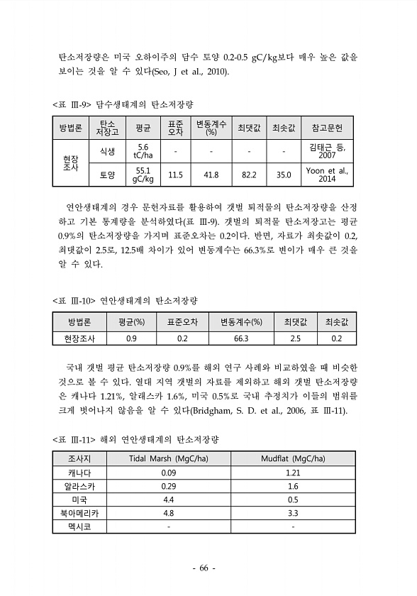 방법론 탄소 저장고 평균 표준 오차 변동계수 % 최댓값 최솟값 참고문헌 현장 조사 식생 5.6 tC/ha 김태근 등, 2007 토양 55.1 gC/kg 11.5 41.8 82.2 35.0 Yoon 2014 et al., 표 담수생태계의 탄소저장량 방법론 평균 % 표준오차 변동계수 % 최댓값 최솟값 현장조사 0.9 0.2 66.3 2.5 0.2 표 연안생태계의 탄소저장량 조사지 Tidal Marsh MgC/ha Mudflat MgC/ha 캐나다 0.09 1.21 알라스카 0.29 1.6 미국 4.4 0.5 북아메리카 4.8 3.3 멕시코 표 해외 연안생태계의 탄소저장량 탄소저장량은 미국 오하이주의 담수 토양 보다 매우 높은 값을 보이는 것을 알 수 있다 연안생태계의 경우 문헌자료를 활용하여 갯벌 퇴적물의 탄소...