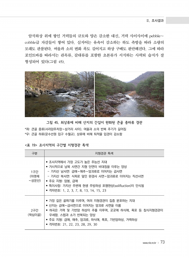 Ⅱ. 조사결과 www.nie.re.kr ? 73 구분 지형경관 특색 1구간 아랫재 ∼상운산 ? 조사지역에서 가장 고도가 높은 주능선 지대 ? 거시적으로 남북 사면간 지형 단면이 비대칭을 이루는 양상 가지산 남사면급애∼애추∼암괴류로 이어지는 급사면 가지산 북사면식피로 덮인 완경사 사면∼암괴류로 이어지는 직선사면 ? 주요 지형암봉, 급애 ? 특이사항가지산 주변에 현생 주빙하성 포행현상 soilfluction 이 인식됨 ? 격자번호1, 2, 3, 7, 8, 13, 14, 15, 23 2구간 학심이골 ? 가장 깊은 골짜기를 이루며, 여러 지형경관이 집중 분포하는 지대 ? 산지는 급애∼급사면으로 이어지는 암괴류 사면을 이룸 ? 하곡은 거력 및 기반암 하상이 주를 이루며, 곳곳에 하식애, 폭포 등 침식지형경관이 우세함...