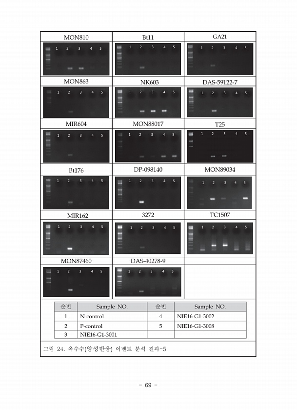 MON810 Bt11 GA21 MON863 NK603 DAS-59122-7 MIR604 MON88017 T25 Bt176 DP-098140 MON89034 MIR162 3272 TC1507 MON87460 DAS-40278-9 순번 Sample NO. 순번 Sample NO. 1 N-control 4 NIE16-G1-3002 2 P-control 5 NIE16-G1-3008 3 NIE16-G1-3001 양성반응