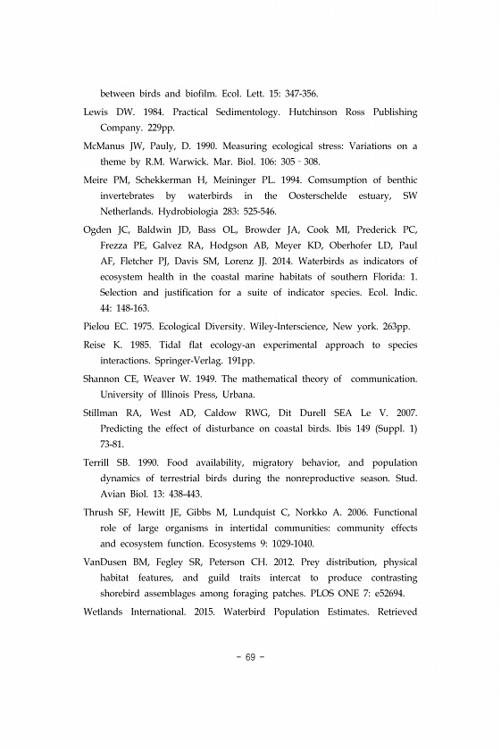 69 between birds and biofilm. Ecol. Lett. 15347-356. Lewis DW. 1984. Practical Sedimentology. Hutchinson Ross Publishing Company. 229pp. McManus JW, Pauly, D. 1990. Measuring ecological stressVariations on a theme by R.M. Warwick. Mar. Biol. 106305?308. Meire PM, Schekkerman H, Meininger PL. 1994. Comsumption of benthic invertebrates by waterbirds in the Oosterschelde estuary, SW Netherlands. Hydr...