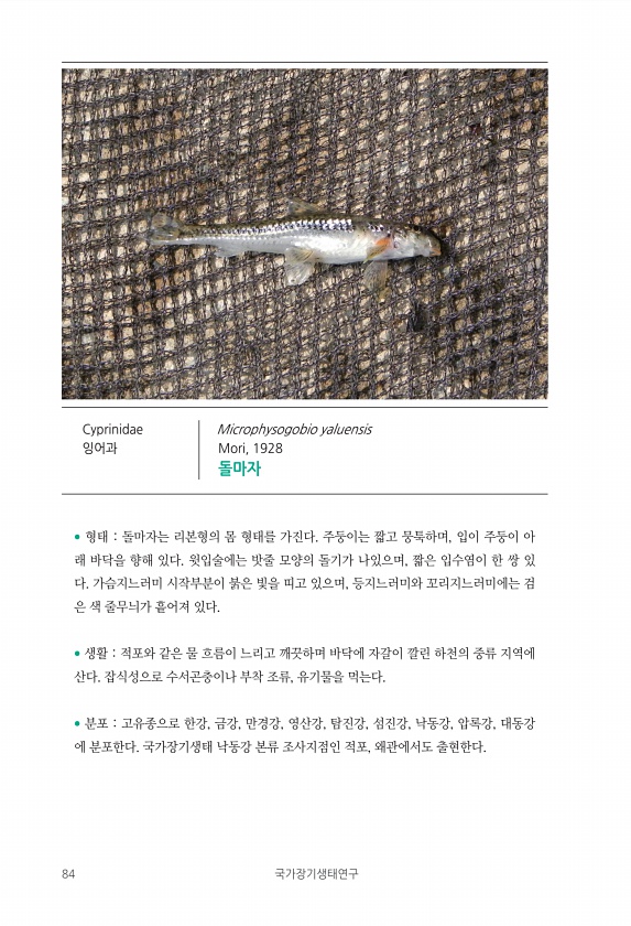 84 국가장기생태연구 ? 형태 돌마자는 리본형의 몸 형태를 가진다. 주둥이는 짧고 뭉툭하며, 입이 주둥이 아 래 바닥을 향해 있다. 윗입술에는 밧줄 모양의 돌기가 나있으며, 짧은 입수염이 한 쌍 있 다. 가슴지느러미 시작부분이 붉은 빛을 띠고 있으며, 등지느러미와 꼬리지느러미에는 검 은 색 줄무늬가 흩어져 있다. ? 생활 적포와 같은 물 흐름이 느리고 깨끗하며 바닥에 자갈이 깔린 하천의 중류 지역에 산다. 잡식성으로 수서곤충이나 부착 조류, 유기물을 먹는다. ? 분포 고유종으로 한강, 금강, 만경강, 영산강, 탐진강, 섬진강, 낙동강, 압록강, 대동강 에 분포한다. 국가장기생태 낙동강 본류 조사지점인 적포, 왜관에서도 출현한다. Cyprinidae 잉어과 Microphysogobio yaluensis Mor...