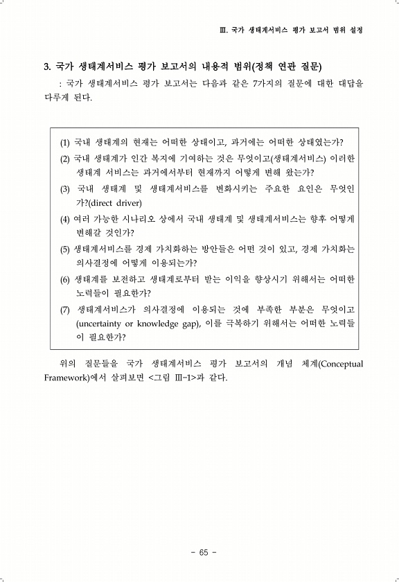 Ⅲ. 국가 생태계서비스 평가 보고서 범위 설정 65 3. 국가 생태계서비스 평가 보고서의 내용적 범위 정책 연관 질문 국가 생태계서비스 평가 보고서는 다음과 같은 7가지의 질문에 대한 대답을 다루게 된다. 1 국내 생태계의 현재는 어떠한 상태이고, 과거에는 어떠한 상태였는가? 2 국내 생태계가 인간 복지에 기여하는 것은 무엇이고 생태계서비스 이러한 생태계 서비스는 과거에서부터 현재까지 어떻게 변해 왔는가? 3 국내 생태계 및 생태계서비스를 변화시키는 주요한 요인은 무엇인 가? direct driver 4 여러 가능한 시나리오 상에서 국내 생태계 및 생태계서비스는 향후 어떻게 변해갈 것인가? 5 생태계서비스를 경제 가치화하는 방안들은 어떤 것이 있고, 경제 가치화는 의사결정에 어떻게 이용되는가? 6 생태계를 ...
