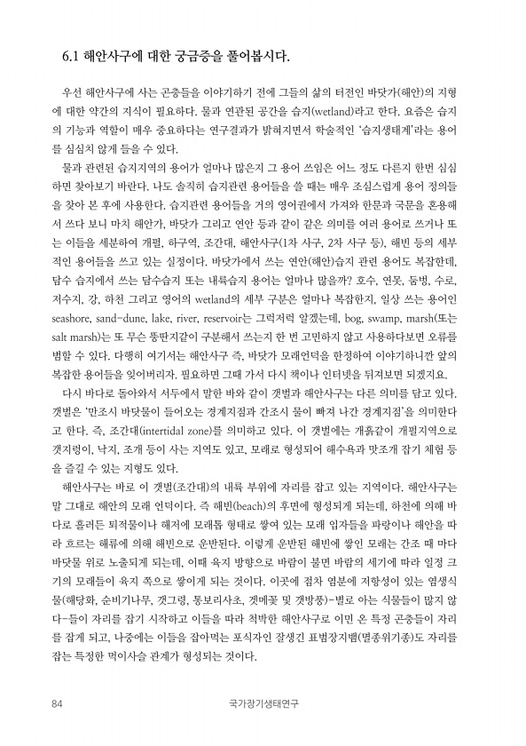 84 국가장기생태연구 6.1 해안사구에 대한 궁금증을 풀어봅시다. 우선 해안사구에 사는 곤충들을 이야기하기 전에 그들의 삶의 터전인 바닷가 해안 의 지형 에 대한 약간의 지식이 필요하다. 물과 연관된 공간을 습지 wetland 라고 한다. 요즘은 습지 의 기능과 역할이 매우 중요하다는 연구결과가 밝혀지면서 학술적인 ‘습지생태계’라는 용어 를 심심치 않게 들을 수 있다. 물과 관련된 습지지역의 용어가 얼마나 많은지 그 용어 쓰임은 어느 정도 다른지 한번 심심 하면 찾아보기 바란다. 나도 솔직히 습지관련 용어들을 쓸 때는 매우 조심스럽게 용어 정의들 을 찾아 본 후에 사용한다. 습지관련 용어들을 거의 영어권에서 가져와 한문과 국문을 혼용해 서 쓰다 보니 마치 해안가, 바닷가 그리고 연안 등과 같이 같은 의미를 ...