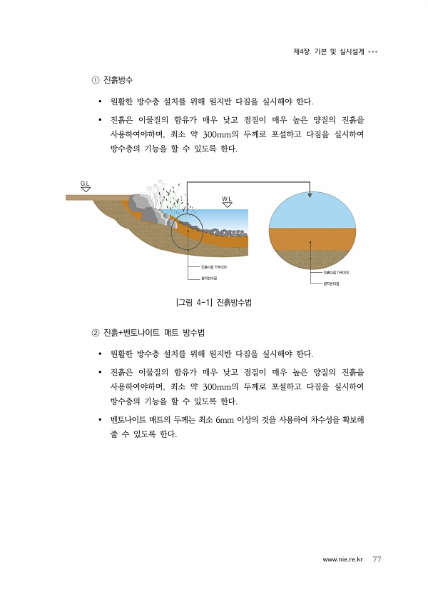 www.nie.re.kr 77 제4장. 기본 및 실시설계 ① 진흙방수 원활한 방수층 설치를 위해 원지반 다짐을 실시해야 한다. 진흙은 이물질의 함유가 매우 낮고 점질이 매우 높은 양질의 진흙을 사용하여야하며, 최소 약 300mm의 두께로 포설하고 다짐을 실시하여 방수층의 기능을 할 수 있도록 한다. [그림 4-1] 진흙방수법 ② 진흙+벤토나이트 매트 방수법 원활한 방수층 설치를 위해 원지반 다짐을 실시해야 한다. 진흙은 이물질의 함유가 매우 낮고 점질이 매우 높은 양질의 진흙을 사용하여야하며, 최소 약 300mm의 두께로 포설하고 다짐을 실시하여 방수층의 기능을 할 수 있도록 한다. 벤토나이트 매트의 두께는 최소 6mm 이상의 것을 사용하여 차수성을 확보해 줄 수 있도록한다.