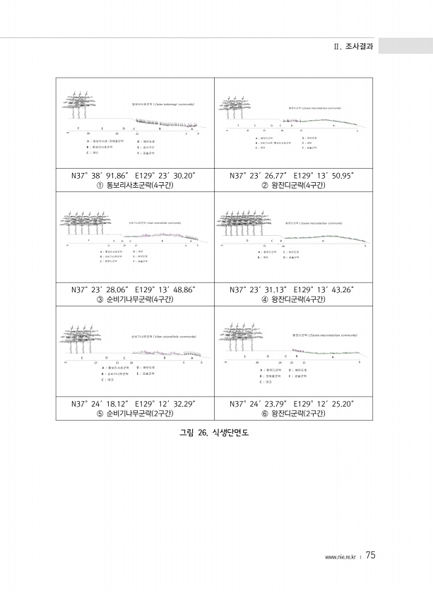 Ⅱ. 조사결과 www.nie.re.kr ? 75 N37°38′91.86″ E129°23′30.20″ ① 통보리사초군락 4구간 N37°23′26.77″ E129°13′50.95″ ② 왕잔디군락 4구간 N37°23′28.06″ E129°13′48.86″ ③ 순비기나무군락 4구간 N37°23′31.13″ E129°13′43.26″ ④ 왕잔디군락 4구간 N37°24′18.12″ E129°12′32.29″ ⑤ 순비기나무군락 2구간 N37°24′23.79″ E129°12′25.20″ ⑥ 왕잔디군락 2구간 그림 26.식생단면도