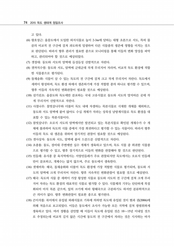 74 2015 독도 생태계 정밀조사 고 있다. 6 왕호장근울릉도에서 도입한 외지식물로 높이 2-3m에 달하는 대형 초본으로 서도, 특히 물 골의 비교적 전 구간에 걸쳐 과도하게 밀생하여 다른 식물종의 생존에 영향을 미치는 것으 로 판단된다. 따라서 향후 관리가 필요한 종으로 모니터링을 통해 이들의 변화 양상을 파악 하고, 관리되어야 할 것으로 예상되었다. 7 갯장대동도와 서도의 암벽에 듬성듬성 산발적으로 자란다. 8 갯까치수염동도와 서도, 암벽에 군데군데 작게 무리지어 자라며, 비교적 독도 환경에 적합 한 식물종으로 평가된다. 9 돌채송화식물이 살 수 있는 독도의 전 구간에 걸쳐 크고 작게 무리지어 자란다. 독도에서 세력이 왕성하며, 독도 환경 하에서 생존하기에 가장 적합한 종의 하나로 평가할 수 있으며, ...