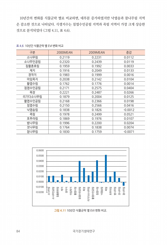 84 국가장기생태연구 10년간의 변화를 식물군락 별로 비교하면, 대부분 증가하였지만 낙엽송과 참나무림 지역 은 감소한 것으로 나타났다. 식생지수는 침엽수인공림 지역과 죽림 지역이 가장 크게 상승한 것으로 분석되었다 그림 4.11, 표 4.6 표 4.6 10년간 식물군락 별 EVI 변화 비교 구분 2000MEAN 2009MEAN 증감 소나무림 0.2119 0.2231 0.0112 소나무인공림 0.2320 0.2439 0.0119 침활혼효림 0.1959 0.1992 0.0033 제지 0.1916 0.2049 0.0133 경작지 0.1983 0.1999 0.0016 미임목지 0.2038 0.2142 0.0104 활엽수림 0.1762 0.1776 0.0014 침엽수인공림 0.2171 0.2575 0.0404 목장 ...