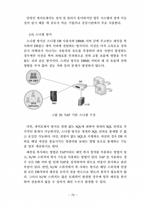 인라인 게이트웨이는 설치 및 관리가 용이하지만 업무 시스템의 장애 가능 성이 있기 때문 에 규모가 작은 기업이나 공공기관에서 주로 사용한다. 나 스니핑 방식 스니핑 방식은 스니핑 DB 사용자와 DBMS 서버 간에 주고받는 패킷을 복 사하여 DB접근 제어 서버에 전달하는 방식이다. 이것은 마치 고속도로 상의 감시 카메라가 지나가는 자동차의 속도를 측정하여 과속 차량이 발생하는 경우에만 사진을 찍어 과태료를 부과하므로 전혀 교통 흐름에 영향을 주지 않는 것과 같은 방식이다. 스피닝 방식은 DBMS 서버의 패 킷 흐름에 전혀 영향을 주지 않아 성능 저하 등의 문제가 발생하지 않는다. 그림 29. TAP 기반 스니핑 구성 다만, 게이트웨이 방식은 권한 없는 SQL에 대하여 개개의 SQL 단위로 즉 각적인 통제가 가...
